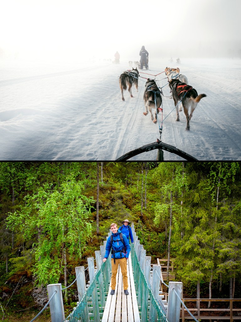 La ville de Kuusamo élue par l’OMS ville où l’air est le plus pur au monde est aussi la porte d’entrée de la Laponie finlandaise. Avec ses 2,6 habitants au km2, cette région caractéristique d’un paysage de Taïga est un sanctuaire peuplé d’ours, d’élans, de rennes, de lynx et de loups.